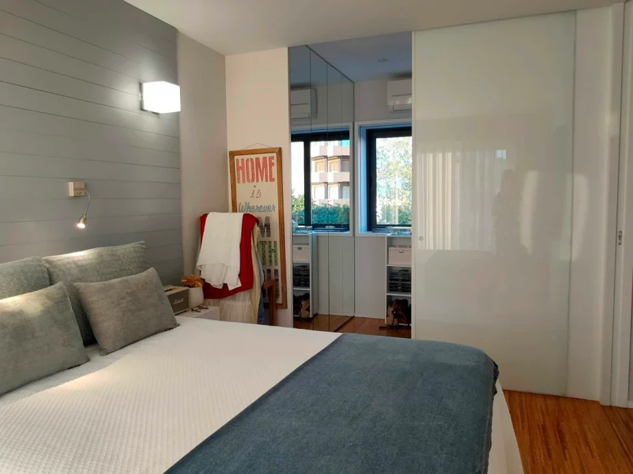 Com áreas controladas, criou-se um quarto com closet – funcional, elegante e muito convidativo.