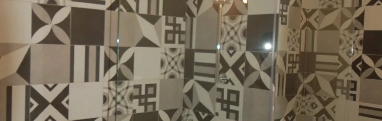 Criou-se um painel de destaque na zona de banho, através de um jogo com peças cerâmicas, que associado ao candeeiro suspenso do tecto – opção menos previsível para um wc – dá a este espaço características únicas e uma presença marcante.